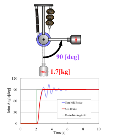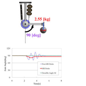 When the brake is not applied, the arm drops and vibrates due to the load of the weight (blue line), but when the MR brake is applied (red line), both the drop of the arm and the vibration is suppressed.