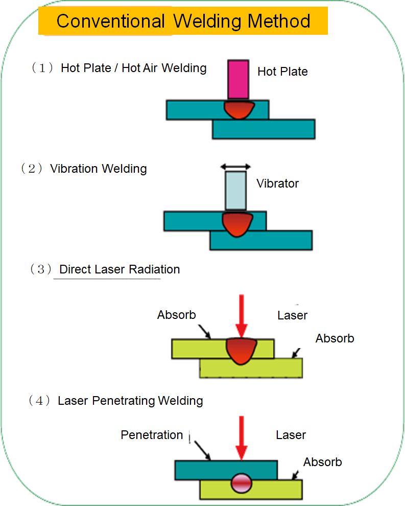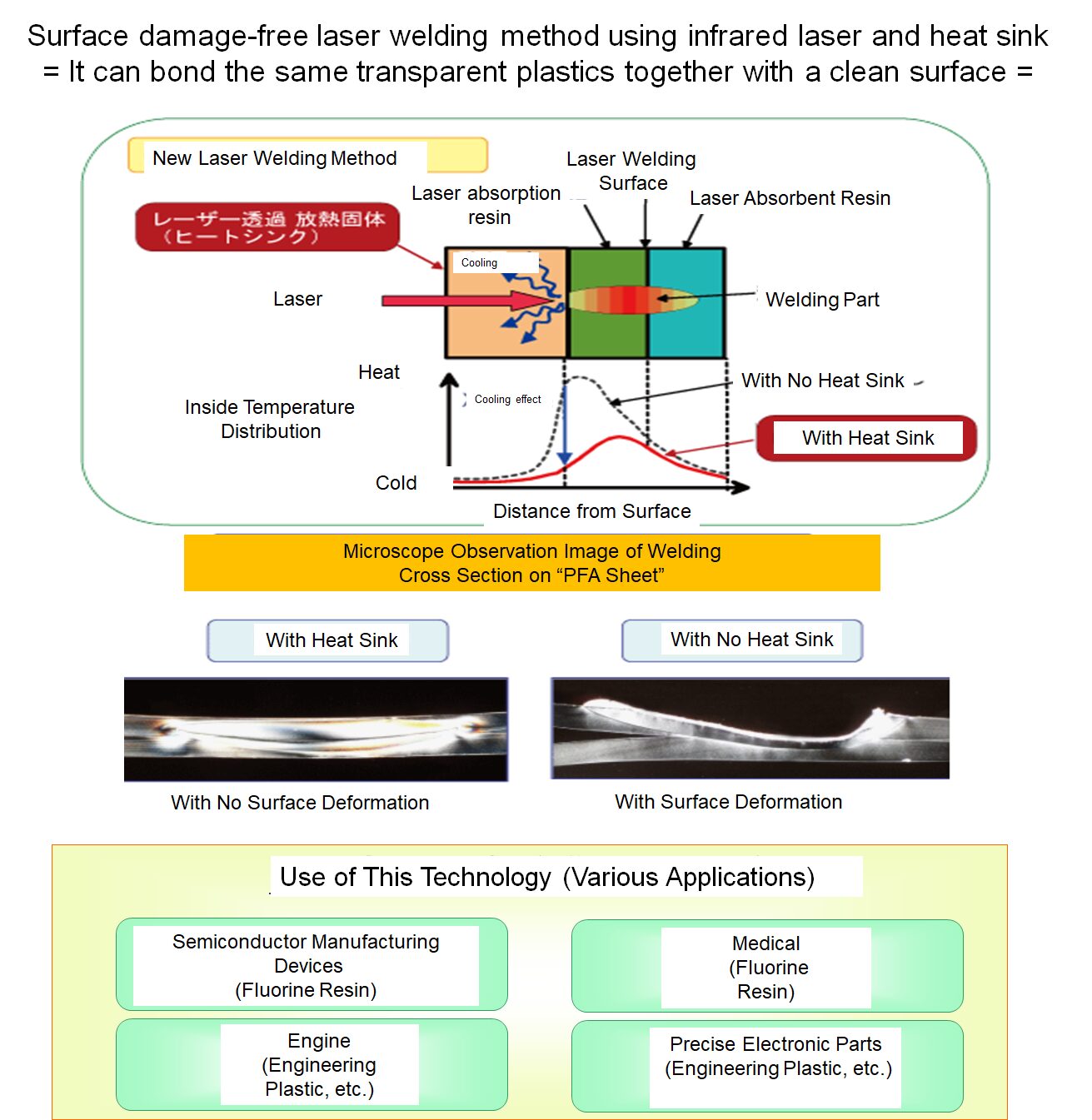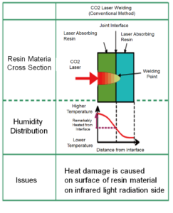 – There is also a method to execute laser welding by superposing the same transparent resins together and putting dyes between the interfaces. However, this method requires a lot of time and cost, and the use of dyes, carbon black and adhesives bond tend to be avoided in medical applications.
