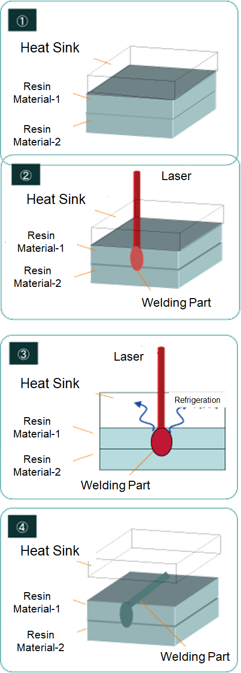 3) Beam laser from the top of the heat sink.Although, the resin absorbing laser generates heat by converting the laser beam into heat, the heat sink radiates heat from resin surface. Therefore, the resin surface does not cause thermal deformation, and only the junction becomes hot and welded.