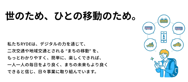 RYDE株式会社は、「世のため、ひとの移動のため。」をビジョンに掲げ、2019年9月に設立されたスタートアップ企業です。デジタルの力を通じて、二次交通や地域交通といった「まちの移動」をわかりやすく・簡単に・楽しくすることで、一人ひとりの毎日をより良く、まちの未来もより良くできると信じ、日々事業に取り組んでいます。