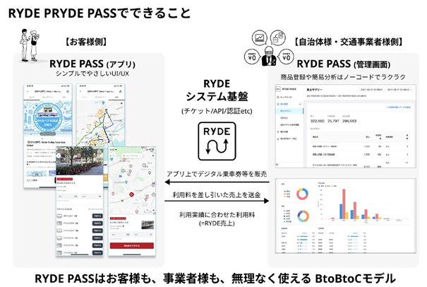 RYDE PASSは、利用者(エンドユーザー)・交通事業者・自治体のいずれにとっても「無理なく使える」BtoBtoCモデルを採用しています。交通事業者や自治体は、システムの開発や保守を自ら行う必要なく、管理画面から簡単にサービスを利用することができます。