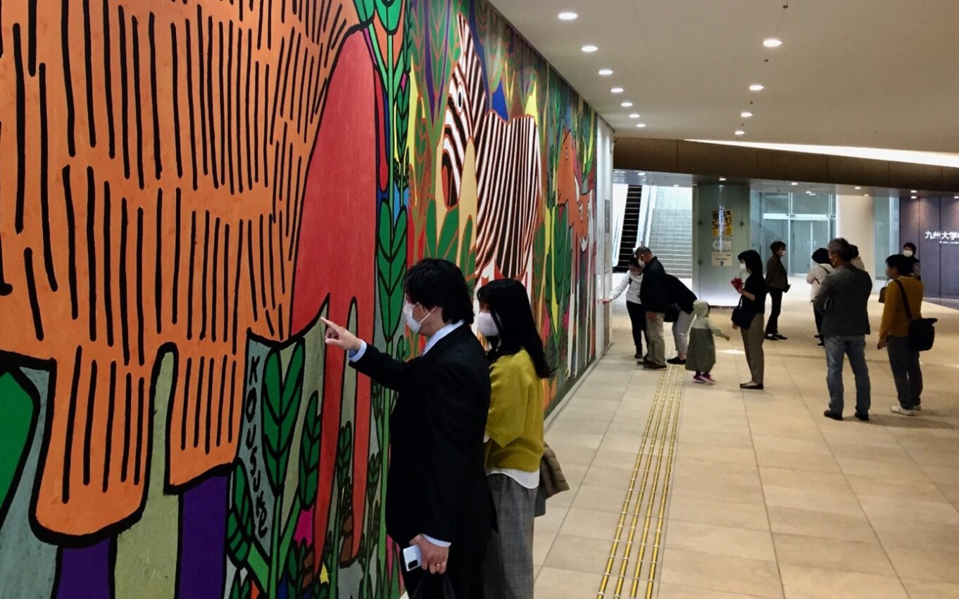 らくちんラボでは、キャンパス内に障害のあるアーティストの作品を日常的に展示する取り組みも推進しています。「障害があるからこそ描けるアートを日常的に目にしてもらう」ことで、多様性への気づきを育む空間を構築することが目的です。地元企業等のスポンサーシップを活用してキャンパス各所への設置を進めており、福岡・天神の工事仮囲いを活用した街なかへの展開も実現しています(読売新聞に掲載)。