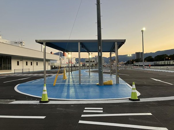 らくちんラボは、もともと従来型の駐車場として緑地で計画されていた後方のスペースをアスファルト舗装に変更し、車両が通り抜けできる構造にするアイデアを提案・実装しました。コストはほとんど変わらないにもかかわらず、バックが不要なため実証実験では切り返し回数・ハンドル回転数・駐車所要時間がいずれもおよそ半減するという効果が確認されています。この取り組みはその後、別府港のフェリーターミナルにも社会実装されました。