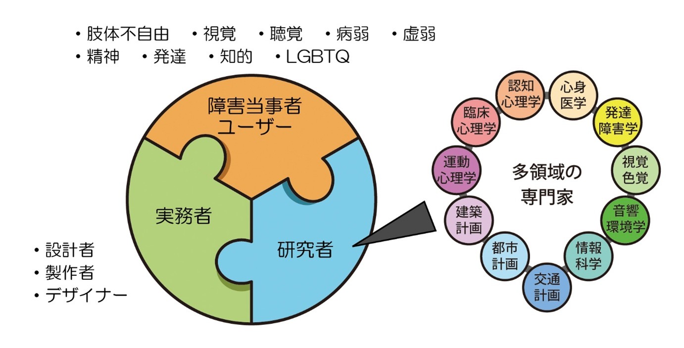 インフラや空間の専門領域(土木・建築)を中心に、心理学・医学・障害学・色覚・音響など、非常に幅広い専門分野の研究者がチームを組んでいます。「空間」を対象とし、キャンパスや公共インフラをインクルーシブにしていくことを主眼に置いています。
