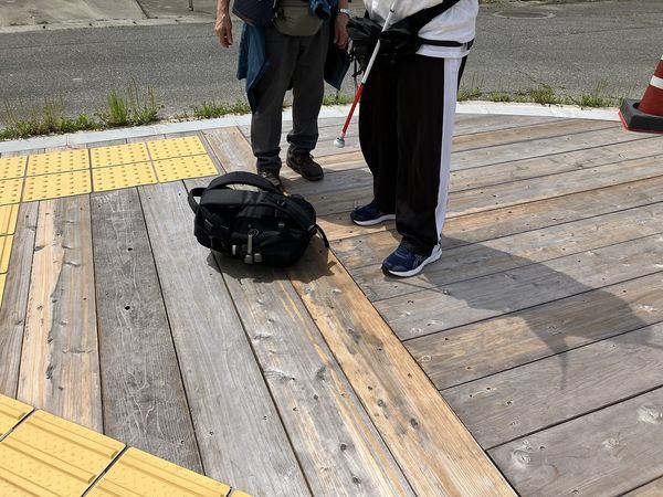 視覚障害のある方が白杖で歩道を確認しながら歩く際、アスファルト舗装では歩道と車道の音の差がほとんどなく、誤って車道に出てしまうリスクがあります。らくちんラボが開発した木製歩道は、デッキ構造による独特の音響特性を利用し、白杖の叩く音が舗装材によって明確に変わるため、視覚障害のある方が歩道と車道の境界を音で認識できます。42名を対象とした実証実験では、木製歩道から出発した参加者は全員が誤って車道に進入することなく正しく歩行できたと報告されています。