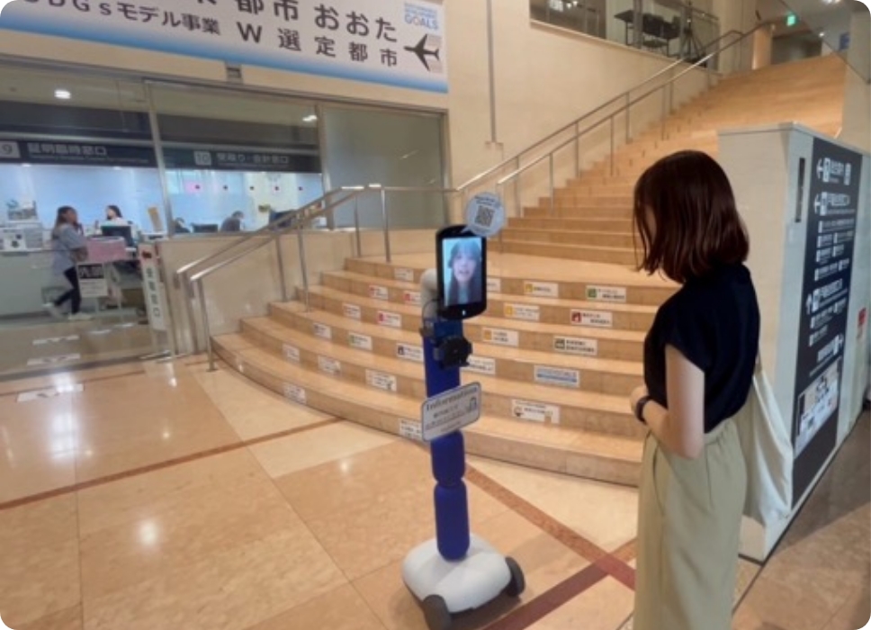 avatarin(株)が提供するアバターロボットnewmeを用いることで、遠隔から人が接客することが可能です。
