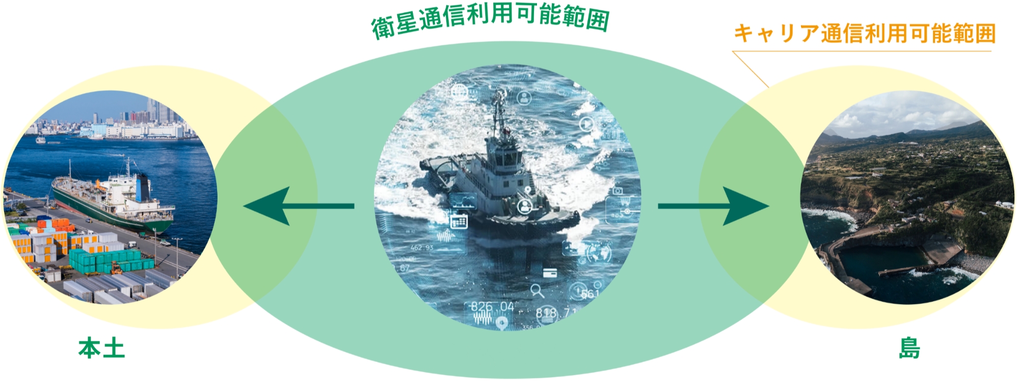 離島航路は、離島の生活の柱であるものの、航路維持が大きな課題です。(株)エイトノットの自律航行技術と衛星通信により、離島航路維持に貢献します。