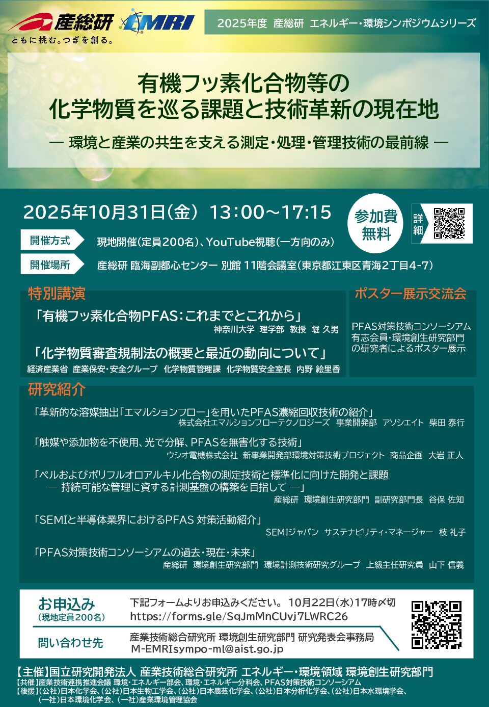 【10月31日開催】2025年度 産総研エネルギー・環境シンポジウムシリーズ 有機フッ素化合物等の化学物質を巡る課題と技術革新の現在地 ― 環境と産業の共生を支える測定・処理・管理技術の最前線―