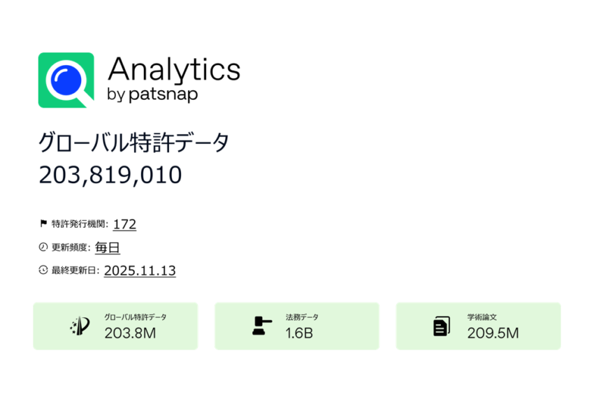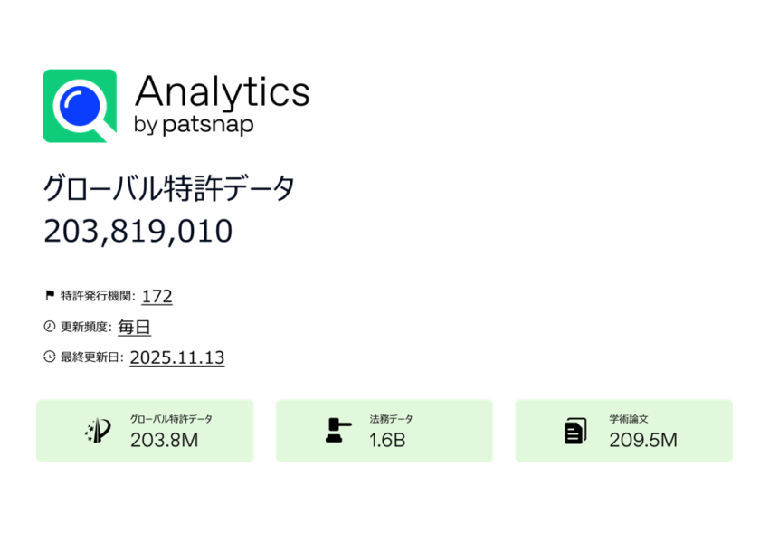 Patsnap Analytics - 特許検索/分析Analyticsは、特許・技術・競合を横断的に分析するコア製品です。世界中の特許データ、非特許文献、企業情報を統合し、グローバルデータでFTO(Freedom to operate)と先行技術調査を強化。R&D戦略・知財戦略・投資判断を支援します。大学の研究者や産学連携担当者が、特許戦略を立てる際に役立ちます。