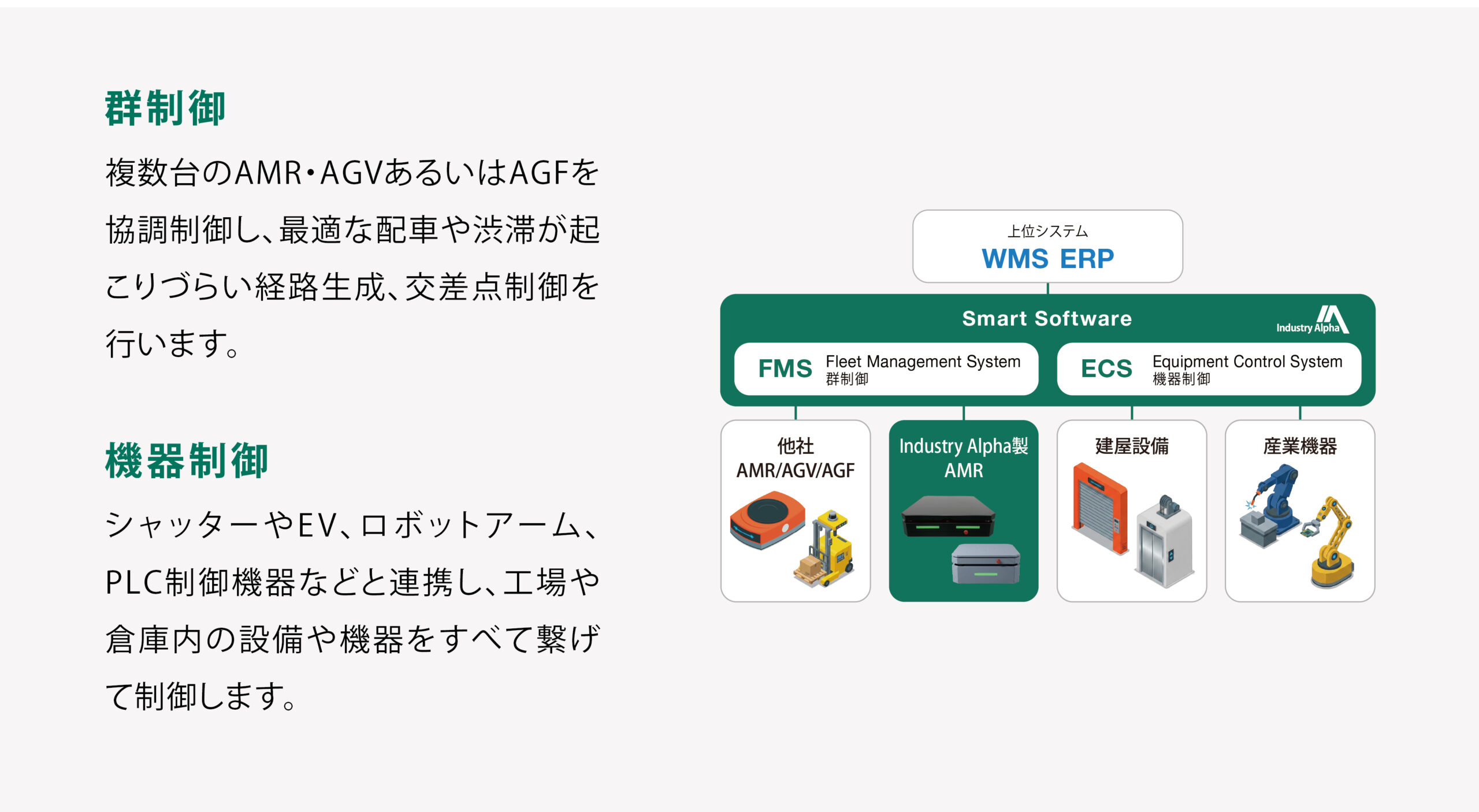 Smart Software:搬送ロボットの群制御からエレベーターやロボットアームなどの機器制御、上位システム統合まで、倉庫や工場の自動化に必要なソフトウェア群を自社開発しています。中核となるフリート管理システム Alpha-FMS はメーカーを問わず複数のAMR・AGVを一元管理できるほか、シャッターやエレベーター、ロボットアームなどの機器制御をするECS (Equipment Control System)、搬送物のロケーション管理をするLMS (Location Management System)など、現場の要件に応じて組み合わせる複数のアプリケーションで構成されています。WMSなどの上位システムとの連携にも対応しています。