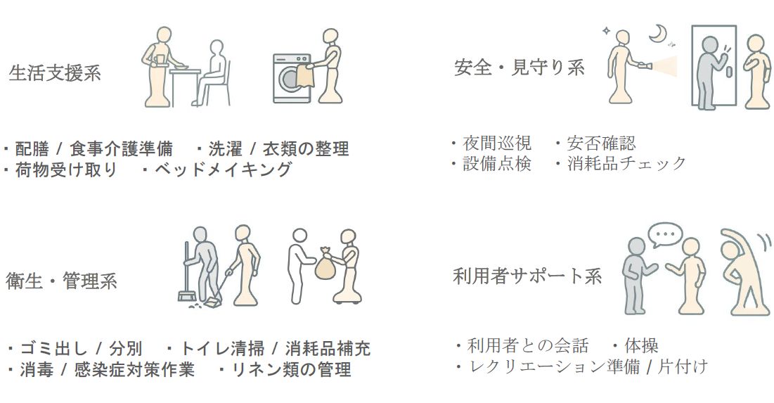 衛生・管理系:ゴミ出し/分別、トイレ清掃/消耗品補充、消毒/感染症対策作業、リネン類の管理など