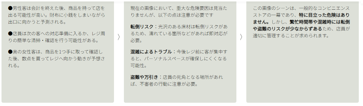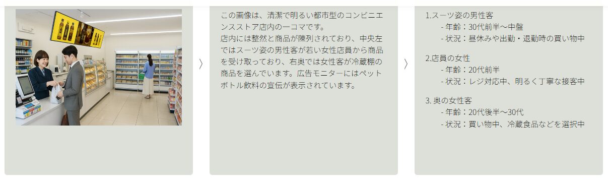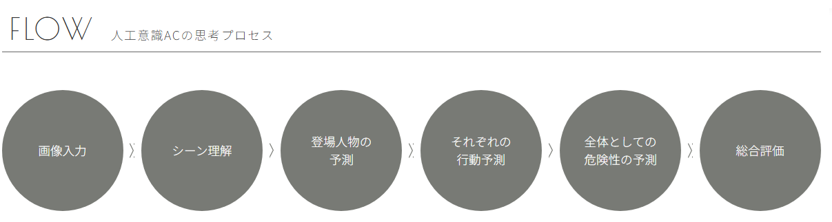人工意識ACを搭載したシステムは、VLMがカメラ映像をシーン全体として解釈し、「コンビニのレジ前でサラリーマンが商品を受け取っている」といった自然言語レベルの状況把握が可能です。さらにLLMがその文字列と常識・ドメイン知識を組み合わせて「この状況において何をすべきか」を自律判断します。