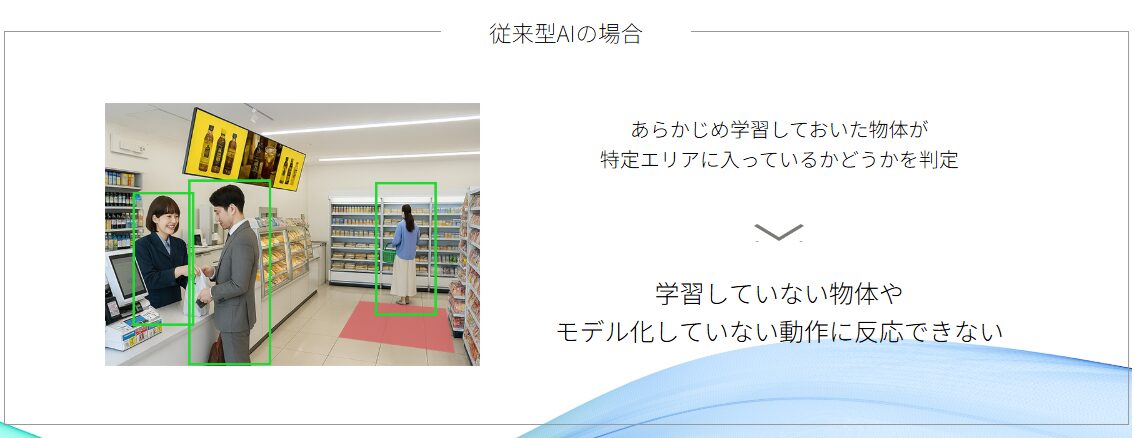 例えば、棚の周りを繰り返しウロウロしている人物に対して、「万引きに特有の行動パターン」という常識をもとに、声かけを行うロボットへ指示を出したり、通報先に通知したりすることができます。これはあらかじめ「ウロウロする行動=万引き」と学習させていなくても判断できる点が、従来型AIとの本質的な違いです。