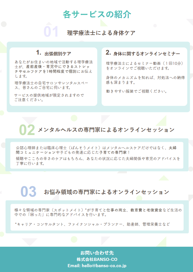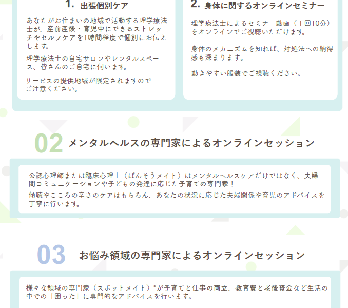 身体的ケアによって間口は広がった一方で、子育て世代の方々の「自分のケアは後回し」という現実や、特に子育て世代はすでに自治体から多くの無料サービスの提供を受けており、有料サービスを利用することへの抵抗感が根強いという課題に直面しました。このとき、身体的ケアからメンタルヘルスケアへ繋げる難しさを感じました。