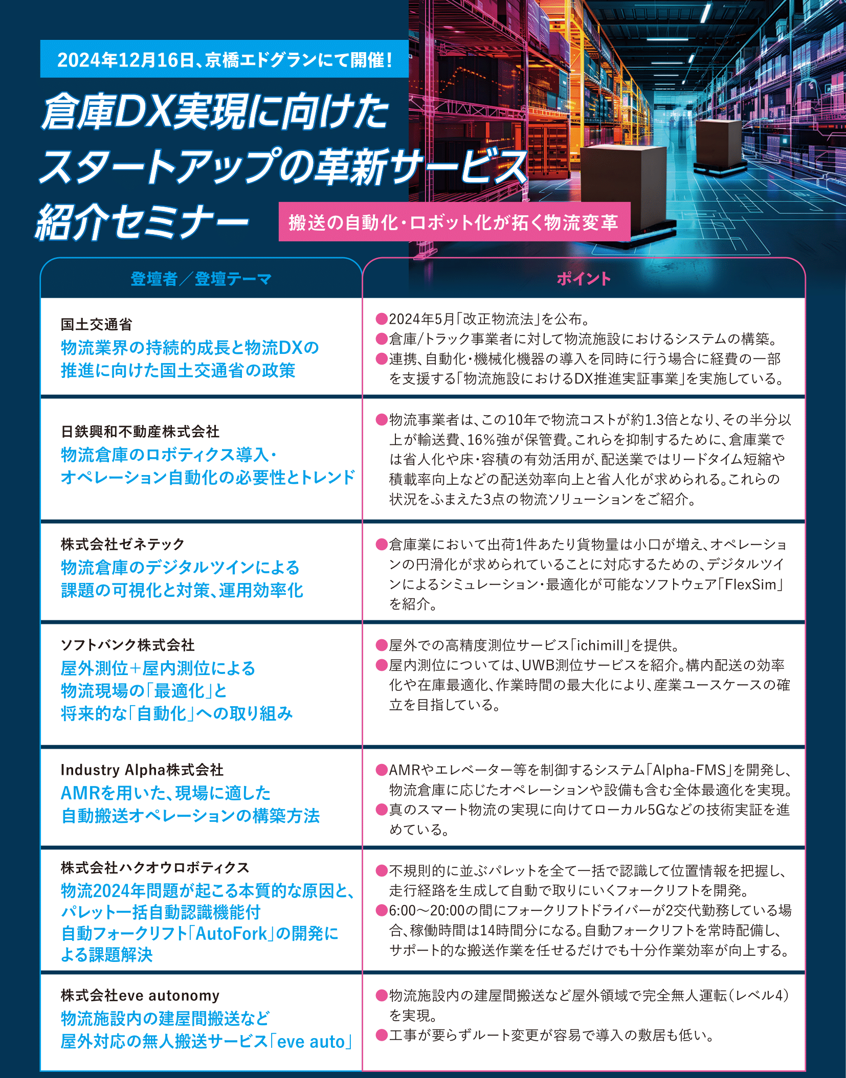 物流業界が直面する「物流2024年問題」。ドライバーの時間外労働規制強化により、輸送能力の不足が深刻化するなか、業界全体での省力化・省人化・生産性向上は待ったなしの課題となっています。こうした状況を背景に、Industry Alpha株式会社と株式会社キャンパスクリエイトは、2024年11月に「倉庫DXオープンイノベーション推進プロジェクト」を立ち上げました。その第一弾イベントとして、2024年12月16日、東京・京橋のIncubation CANVASにて「倉庫DX実現に向けたスタートアップの革新サービス紹介セミナー~搬送の自動化・ロボット化が拓く物流変革」を開催しました。 セミナーでは冒頭、キャンパスクリエイトよりローカル5Gの動向が紹介されました。基地局の価格低減傾向や、新通信規格「RedCap」の普及による端末コストの低下、2025年中に見込まれるローカル5G免許の法改正など、倉庫業界にとって使いやすい環境が整いつつあることが示されました。また、2026年には荷主企業に物流統括管理者(CLO)の設置が義務付けられる予定であり、物流DXの推進は急務であると強調されました。 基調講演では、国土交通省の担当官が「物流改正法」について解説。荷主・物流事業者に対し物流効率化への取り組みを義務化し、荷待ち・荷役時間の削減や積載率向上に向けた国の関与が強化される方針が示されました。また、物流施設における「DX推進実証事業」の事例として、マテハンシステム導入による作業コスト40%削減、RFIDシステムによる貨物探索時間50%削減、バース予約システムによる荷待ち時間30%削減などの実績が紹介されました。 物流不動産デベロッパーの日鉄興和不動産は、物流コストがこの10年で約1.3倍に上昇するなかで、省人化・床面積の有効活用が不可欠と指摘。デジタルツインによるシミュレーションを活用するゼネテックは、倉庫のレイアウトや人員配置、設備台数などを仮想空間で検証できる3Dラインシミュレーションソフト「FlexSim」を紹介し、低コスト・ノーリスクで課題検証ができる利点を解説しました。ソフトバンクは屋外・屋内測位サービスを紹介し、UWB技術による水平誤差30センチ以内の屋内測位で在庫最適化や作業効率向上を目指す取り組みを発表しました。 後半のスタートアップセッションでは、Industry Alphaがガイドレスで自律走行するAMR(自律走行ロボット)と、それらを制御するFMS(フリートマネジメントシステム)「Alpha-FMS」を紹介。工程ごとの自動化を連動させ、全体最適を実現するスマート倉庫の構想を示し、ローカル5Gのような高品質・低遅延ネットワークの重要性も訴えました。ハクオウロボティクスは、業界初となる複数パレットの一括自動認識機能を持つ自動フォークリフト「AutoFork」を紹介。従来の手動フォークリフト作業を自動化し、ドライバー不足にも対応できる即戦力ソリューションとして注目を集めました。eve autonomyは、工場・物流施設の敷地内屋外搬送を自動化する「eve auto」を紹介し、工事不要・ルート変更が容易・サブスクで初期投資を抑制できるという導入のしやすさが参加者の関心を集めました。2024年12月時点で全国40拠点・70台以上が稼働中です。 閉会挨拶でIndustry Alphaは「課題ドリブンな提案が印象的だった。最先端技術をいち早く現場に実装していこう」と締めくくり、その後のネットワーキングでも活発な名刺交換・情報交換が行われました。