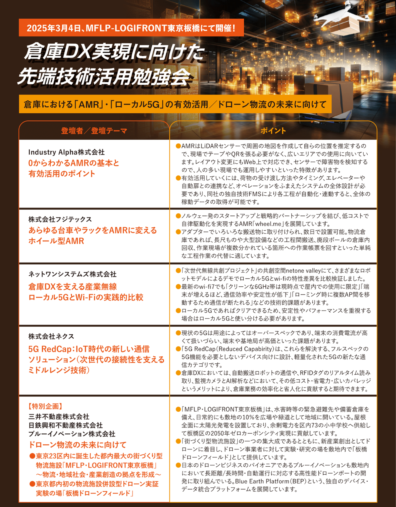 「倉庫DXオープンイノベーション推進プロジェクト」第2回目となるイベントが、2025年3月4日に開催されました。会場は2024年9月に竣工した都内最大級の街づくり型物流施設「MFLP・LOGIFRONT東京板橋」。倉庫DXの代表的な構成機器「AMR(自律走行搬送ロボット)」と、AMR等の搬送機・ロボットを倉庫内で有効活用するために期待される「ローカル5G」を中心に取り上げ、基礎知識から活用のポイント、今後の技術的展望まで幅広く紹介しました。さらに特別企画として、物流業界での普及が期待されるドローンをテーマにした講演と、「板橋ドローンフィールド」の見学ツアーも実施されました。 前半のAMRセッションでは、まずIndustry AlphaがAMRの基本から解説しました。AMRはLiDAR(ライダー)センサーで周囲の地図を自律作成し、現場への磁気テープ・QRコード設置が不要で、広いエリアでの使用やレイアウト変更にも柔軟に対応できる点が特徴です。人との共存も可能で、センサーによる障害物検知により、作業員が多い現場でも安全に運用できます。有効活用のためには荷物の受け渡しタイミングやエレベーター・自動扉との連携を含むシステム全体設計が重要であり、同社ではAMRを統合制御するFMS(Fleet Management System)の開発も進めています。フジテックスは、ノルウェー発スタートアップとのパートナーシップによる「wheel.me」(自律型ホイールAMR)を紹介。既存の台車やラックの底部に取り付けるだけで搬送を自動化でき、Wi-Fi環境さえあれば数日で設置可能な手軽さが評価されています。長尺物の工程間搬送や廃段ボール回収など、単純搬送作業の代替に適しています。 ローカル5Gのセッションでは、ネットワンシステムズが共創空間「netone valley」でのAMRを使った実証結果を発表。最新のWi-Fi 7でも「6GHz帯の屋内限定」「端末増加時の通信効率低下」「ローミング時の通信断」などの課題があるとし、安定性やパフォーマンスを重視する倉庫環境ではローカル5Gとの使い分けが必要と提言しました。ネクスは、フルスペック5Gの機能を軽量化した新通信カテゴリ「5G RedCap(Reduced Capability)」を紹介。低コスト・省電力・広カバレッジというメリットにより、自動搬送ロボットの通信やRFIDリアルタイム読み取り、AIカメラ解析など倉庫業務の効率化・省人化に貢献すると期待されており、2027年にはMVNOの5G SAサービスも見込まれるとして、RedCapが次世代のIoT通信の主流になると予測しました。 後半のドローンセッションでは、三井不動産・日鉄興和不動産・ブルーイノベーションの3社が登壇しました。「MFLP・LOGIFRONT東京板橋」は、日本製鉄東京製造所の跡地を活用した都内最大級の物流施設で、板橋区との協議により防災拠点や区内小中学校への余剰電力供給なども担っています。同施設に併設された「板橋ドローンフィールド」はドローン事業者の実験・研究の場として提供されており、ブルーイノベーションが長距離・長時間対応の高性能ドローンポートや統合プラットフォーム「Blue Earth Platform(BEP)」を活用した運用を展開しています。 閉会挨拶でIndustry Alphaは「通信・ロボット・ドローンなど多岐にわたる技術が組み合わさる倉庫・工場のスマート化は総合格闘技のようなもの。全体像と全体最適を見据えて関係者が連携することが重要」と語りました。閉会後の見学ツアーでは、5.5メートルの梁下有効天井高を誇る広大な倉庫スペースや屋上のドローンポートなどが紹介され、参加者の間で活発な意見交換が行われました。