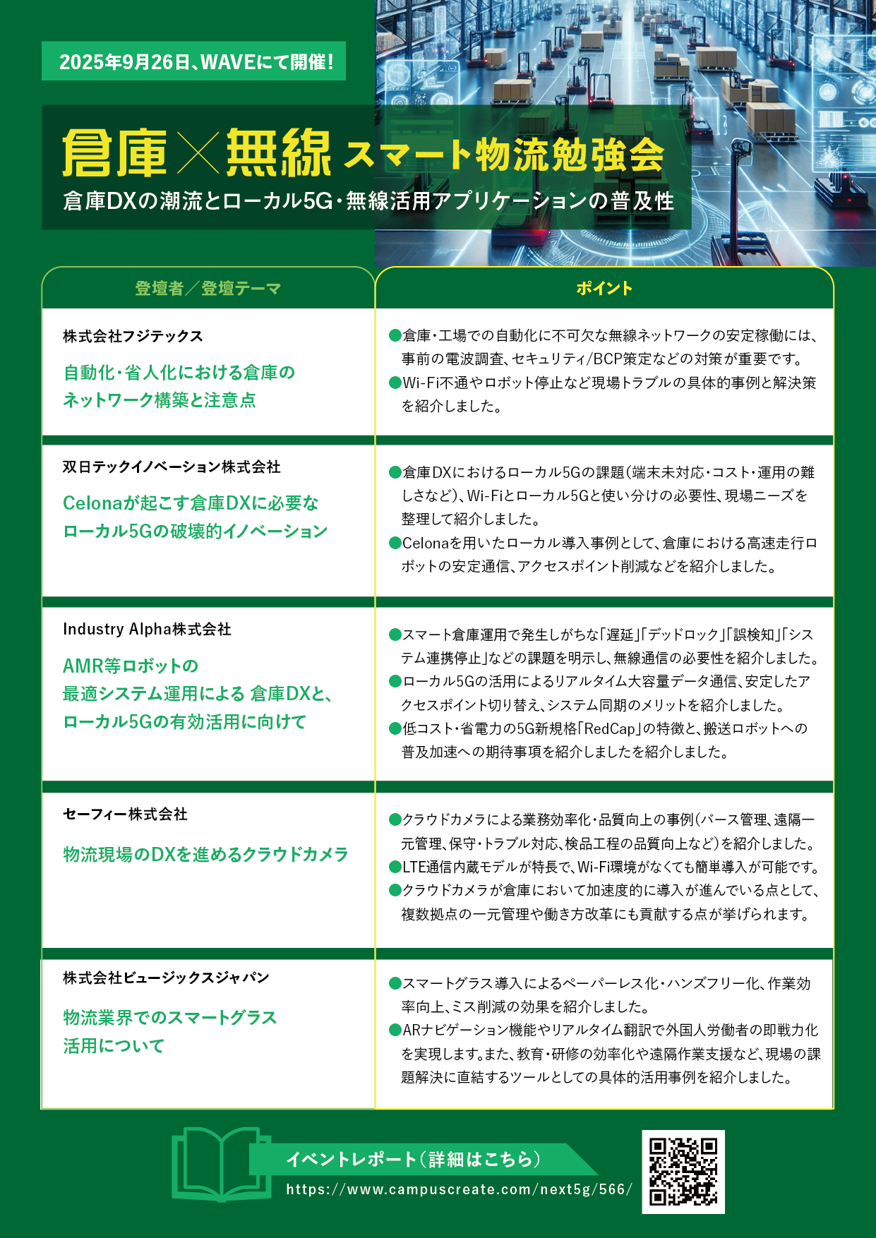 第4回目は、2025年9月26日に東京・中野のフジテックス本社「WAVE」とオンラインのハイブリッド形式で開催されました。テーマは「倉庫における無線ネットワーク構築のポイントとローカル5Gの活用」、そして「物流業界における無線活用アプリケーションの広がり」です。倉庫DXを推進するうえで重要度が増す通信インフラに焦点を当て、実務的な注意点から最新ソリューション、現場で活用できるデバイスまで幅広く紹介されました。 冒頭、キャンパスクリエイトはスマート物流における無線通信の重要性を強調しました。自動化機器を増やすほどに無線インフラの安定性が業務全体に影響する一方で、最適な無線環境の構築は容易ではないと指摘。ローカル5Gについては、今後の機器価格低下・RedCap対応端末の普及・免許取得手続きの簡素化により活用しやすくなり、自動化ロボットやデジタルツインなど多様なアプリケーションの普及が加速すると見通しを示しました。 フジテックスは、倉庫・工場の自動化・省人化における無線ネットワークのトラブル事例と対策を紹介しました。現場で起こりうる問題として「Wi-Fiが繋がらないエリアの発生」「AMRの動作停止・誤作動」「移動中の通信断」から、経営レベルでは「サイバー攻撃による情報漏洩」「システム全体の業務停止」まで多岐にわたることを示したうえで、「事前の専門家による電波調査」「出口対策を含むセキュリティ対策」「UPSやバックアップ回線によるBCP(事業継続計画)の策定」を推奨する対策として提示しました。Wi-Fi不通やAMR停止に対する具体的な解決事例も交えながら、現場担当者が押さえるべき実践的な知識が提供されました。 双日テックイノベーションは、米国Celona社のローカル5Gソリューションを紹介しました。現状のローカル5G普及の壁として「端末・アプリの未対応」「コストの割高感」「運用難」を挙げたうえで、Celona社の製品はLANへの統合・マイクロスライシング・低コスト・運用のシンプルさを特徴とし、スマート倉庫で100台以上の高速走行ロボットの通信を安定化させながらアクセスポイント数を10分の1に削減した導入事例を紹介。ヒューマノイドロボットや倉庫のデジタルツイン化など次世代技術の実用化に向けて、広範囲・多移動体・過酷な環境に適したローカル5Gの重要性を訴えました。 Industry Alphaは、スマート倉庫での無線通信の重要性を改めて整理しました。無線通信の「遅延」が引き起こす「デッドロック(複数ロボットの同時停止)」「誤検知(カメラ映像の遅延による在庫認識ミス)」「システム連携の停止(エレベーター等との通信断)」といった問題を解説し、ローカル5Gがこれらを解決できる理由として、ハンドオーバーの安定性、大容量データのリアルタイム送信、設備間同期によるジャストインタイム実現などを挙げました。また、小型・低電力のRedCapが搬送ロボットへの搭載を容易にし、スマート倉庫の普及をさらに後押しすると期待を示しました。 セーフィーは、クラウドカメラによる物流DXの活用事例を多数紹介しました。LTE内蔵モデルによりWi-Fi環境がなくても電源だけで使える手軽さと、バース(トラック接車場所)の遠隔管理、全国拠点の一元管理、マテハン機器のトラブル対応迅速化、検品・梱包工程の品質向上など、すぐに着手できるDXの一手として参加者の関心を集めました。ビュージックスジャパンは、法人向けスマートグラスによる物流現場の業務改善を紹介。ピッキングのハンズフリー化、ARナビゲーションによる棚誘導、リアルタイム翻訳による外国人労働者の即戦力化など、「未来のデバイス」ではなく現実の課題を解決するツールとして具体的な活用シーンを示しました。 会の終了後も会場では名刺交換や意見交換が活発に行われ、倉庫DX推進に向けた業界の高い関心が伺える盛況なイベントとなりました。