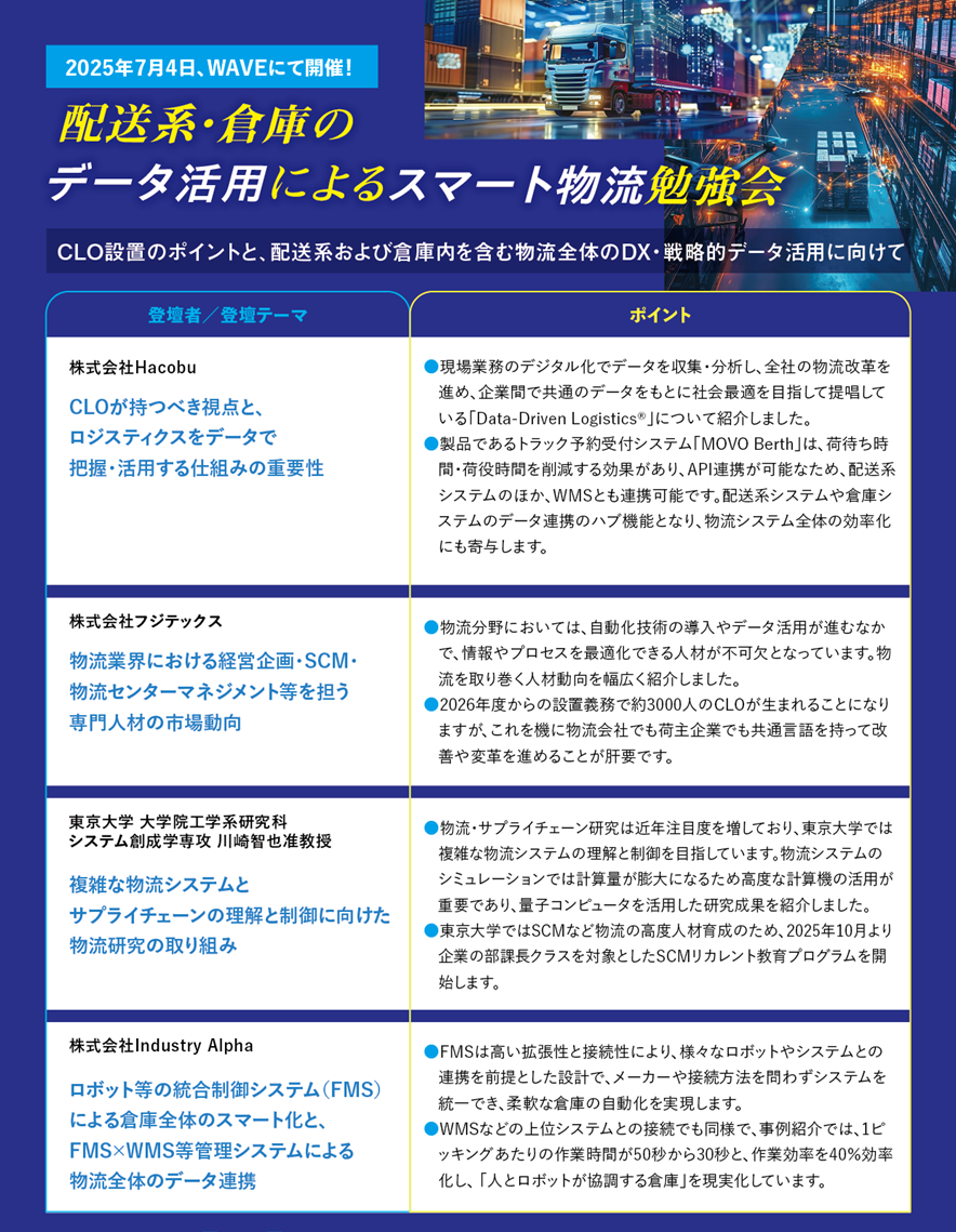 第3回目のイベントは、2025年7月4日、東京・中野のフジテックス本社内オープンイノベーション施設「WAVE」とオンラインのハイブリッド形式で開催されました。テーマは「CLO(物流統括管理者)の確保・育成」と「物流システム全体最適化のための戦略的データ活用」。2026年4月より一定規模以上の荷主企業への設置が義務付けられるCLOの役割と、物流全体をデータでつないで効率化するためのアプローチが、実務に近い形で解説されました。 冒頭、キャンパスクリエイトが趣旨を説明しました。国交省が「物流DXや物流標準化の推進によるサプライチェーン全体の徹底した最適化」を政策として掲げており、配送系では共同配送・企業間連携、倉庫系では輸送とのシームレス化・連携強化が求められているとしたうえで、CLO(物流統括管理者)のデジタル化・効率化のノウハウは物流会社の管理部門やサプライチェーン担当者にも不可欠なものであると強調しました。 Hacobuは、物流課題を解決するアプリケーション「MOVO」と、物流DXコンサルティング「Hacobu Strategy」を紹介しました。CLOに求められるのは、物流コストの効率化にとどまらず、経営メンバーとしてROIC(投下資本利益率)の最大化や環境・レジリエンスの観点からの社会最適化の推進であると指摘。商慣習を見直し、物流と営業・発荷主と着荷主がデータを共有しながら連携するアプローチ「Data-Driven Logistics®」を提唱しています。トラック予約受付システム「MOVO Berth」は荷待ち・荷役時間の削減に効果があり、WMSとのAPI連携も可能で物流システム全体のハブとなりうる点も紹介されました。デンソーや業界横断型「物流ビッグデータラボ」の取り組みなど、全社的に物流改革に乗り出す荷主企業の事例も示されました。 フジテックスは、物流分野の人材市場動向を解説しました。物流企画に関わる求人数はこの10年で約15倍、物流デジタル化関連では約17.5倍に急増し、物流IT人材の募集年収も上昇傾向にあるとのデータを示しました。物流会社から荷主企業への転職希望も2022〜2024年の間に3.5倍以上になっており、荷主企業が自社の物流機能強化に力を入れている実態が伺えます。2026年度から義務化されるCLO(物流統括管理者)は全国で約3,000人が新たに誕生する見込みで、物流会社と荷主企業が共通言語を持って改革を推進することが肝要と締めくくりました。 東京大学大学院工学系研究科の川崎智也准教授は、物流・サプライチェーン研究の最新動向を発表しました。衛星データや土地被覆データを活用した貨物発生・集中量の推定モデル、トラックのOD(Origin-Destination)表の自動推定、EVトラックの走行中無線給電の最適配置研究など、工学的アプローチで物流の複雑な問題に取り組む様子が紹介されました。高度な計算インフラと情報処理技術の活用、そして物流分野の高度人材育成の重要性を訴え、2025年10月からは企業の部課長クラスを対象としたSCMリカレント教育プログラムも開始することが発表されました。 Industry Alphaは、FMS(Fleet Management System)とWMS(倉庫管理システム)の連携による倉庫スマート化の事例を紹介。AMRや自動倉庫・エレベーターなど多様な設備を、メーカーや接続方式を問わず統一的に制御できるFMSの高い拡張性・接続性を示し、FMSとWMSの連携により1ピッキングあたりの作業時間を50秒から30秒へ40%改善した実績を発表しました。人とロボットが協調するスマート倉庫の実現に向けた具体的な道筋が示された講演として、参加者の高い関心を集めました。