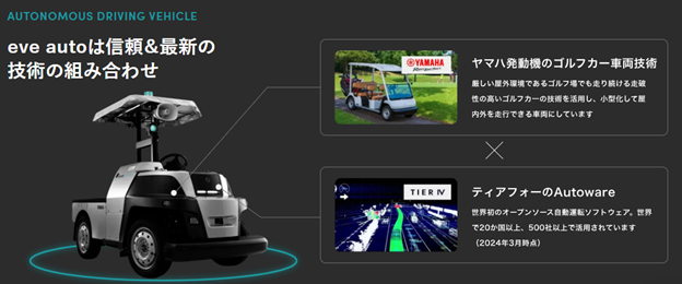 株式会社eve autonomyは、2020年にヤマハ発動機とTIER IVの合弁会社として設立されました。「信頼と実績のゴルフカー車両技術」と「世界最先端の自動運転技術Autoware」という2つの強みを掛け合わせることで、他にはない屋外対応型の無人搬送ソリューションを実現しています。
