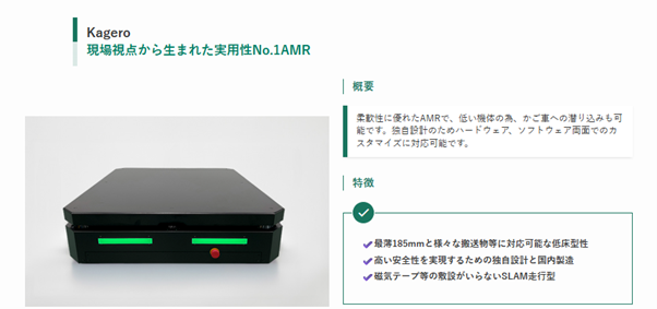 Robotics: 自社開発の薄型・重可搬AMR「Kagero」シリーズを展開。国内の物流・倉庫現場に合わせた安全設計が特徴です。Kageroシリーズは500kg可搬から1,200kg可搬まで展開し、狭い通路でもかご台車の下に潜り込んで重量物を搬送できるのが独自性です。