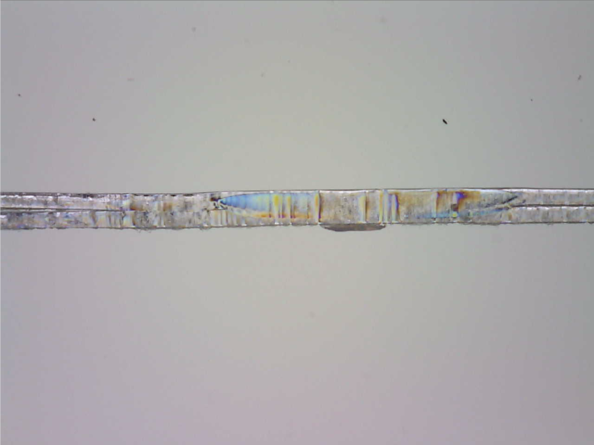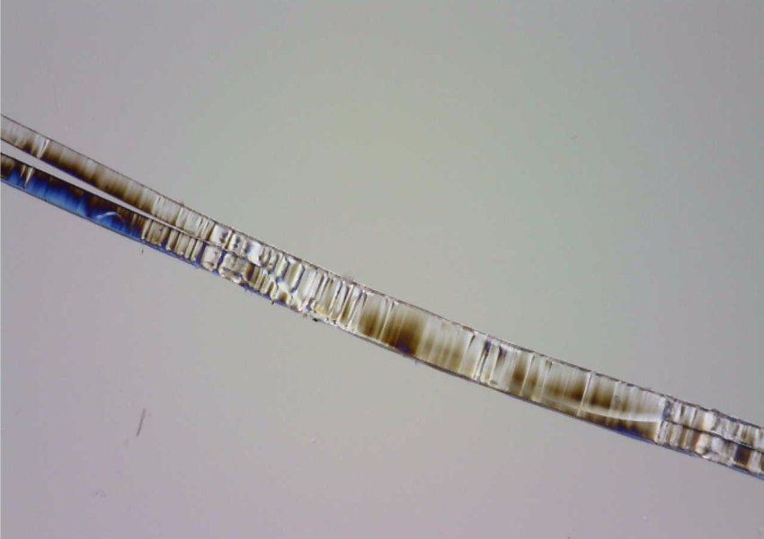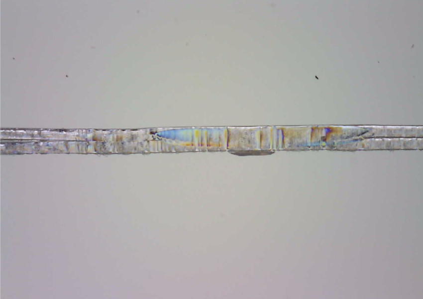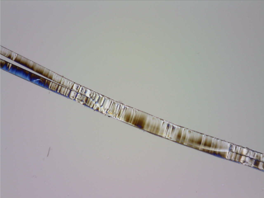 フッ素樹脂にも多くの種類があり、CO2レーザとの組み合わせでは得手不得手もありますが、FEP(四フッ化エチレン・六フッ化プロピレン共重合樹脂)、PFA(四フッ化エチレン・パーフルオロアルコキシエチレン共重合樹脂)などは非常に相性が良く、最適溶着条件の導出のノウハウなども蓄積しています。適切に溶着されたフィルムは、その断面を観察しても2枚のフィルムの向き合う中心部の界面だけが溶けて一体化し、表面は熱損傷していないことが示されます。