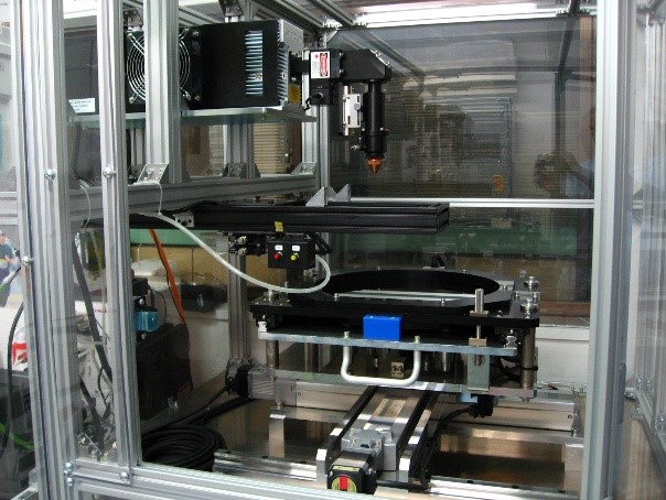 ヒートシンク式レーザ樹脂溶着法を応用したフィルムの溶着装置を試作しました。これは、レーザーとしてCO2ガスレーザー(赤外波長)を採用し、大面積ヒートシンクが組み込まれており凡そA5判程度の大きさの溶着対象フィルム(ワーク)に対応できます。ワークはXYステージ上に配置され、レーザーの点描画の特性を生かして直線や曲線の自在な溶着線の加工を可能としています。従ってバッグの用途によって大きさや形のフレキシブルなデザイン作成に対応できます。
